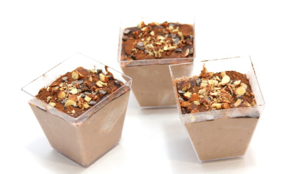 Všetky ingrediencie (okrem drvených lieskových orieškov) vložíme do misky a spolu vyšľaháme. Získaným krémom naplníme poháriky. Vrch nakoniec ozdobíme kakaom a drvenými orieškami a poháriky vložíme do chladničky. Podávame vo vychladenom stave.