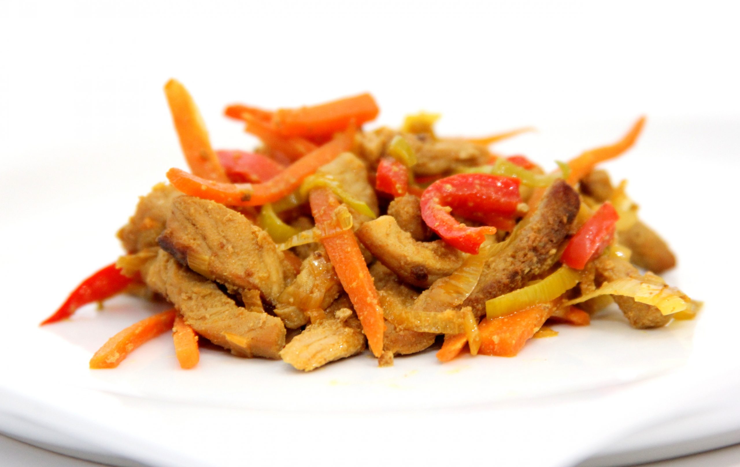 Kuracie mäso oddelíme od kože a nakrájame na kocky alebo plátky. V panvici zohrejeme olej, kuracie mäso v ňom opečieme (trvanie pár minút). Pridáme soľ..